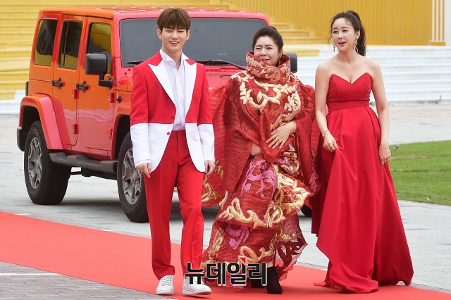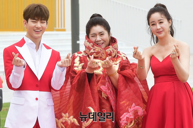 배우 함소원(오른쪽),진화 부부가 21일 오전 인천 중구 파라다이스시티 스튜디오 파라다이스에서 열린 TV조선 예능 '아내의 맛 100회 특집 포토콜 행사'에 앞서 시어머니 중국마마와 함께 레드카펫을 걸어오고 있다.