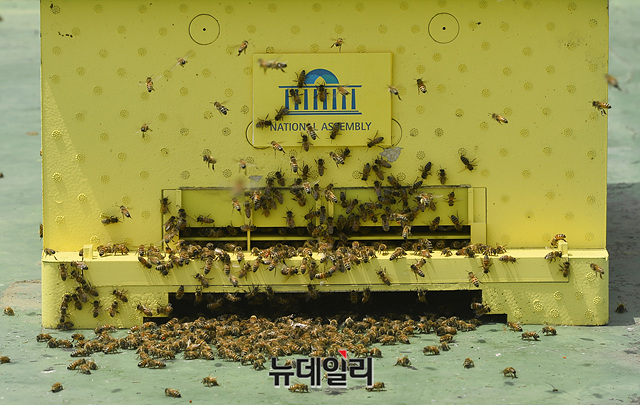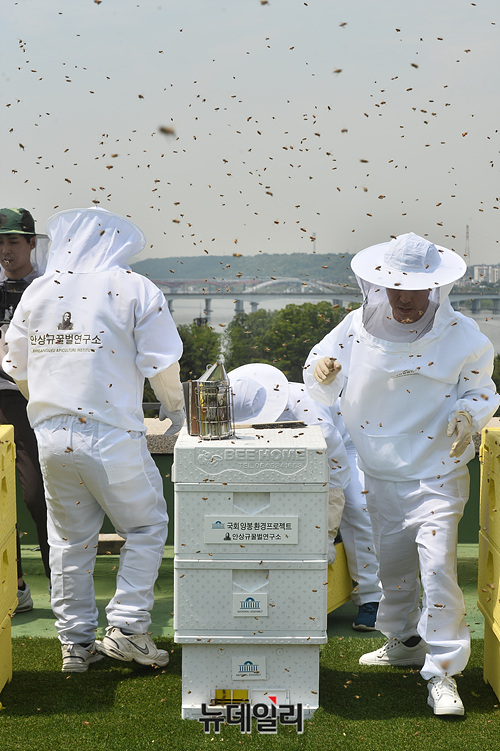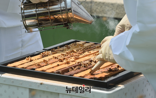 제21대 국회 개원을 앞둔 21일 오후 국회도서관 옥상에서 벌꿀 수확행사에 앞서 안상규벌꿀연구소 직원들이 꿀을 채밀하고 있다. 이날 행사에는 주호영 미래통합당 당대표 권한대행 겸 원내대표, 유인태 국회 사무총장, 안상규 대표 등이 참석했다.