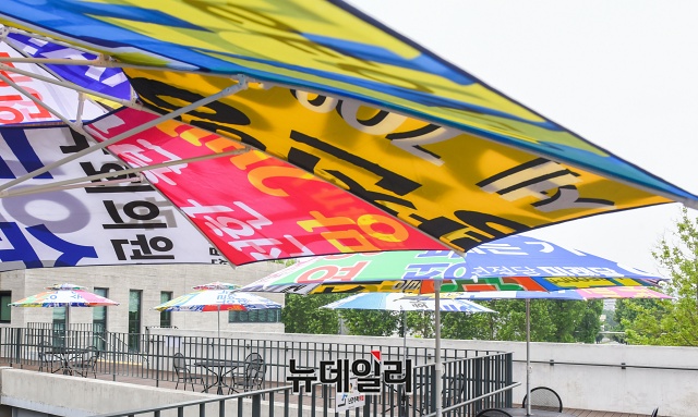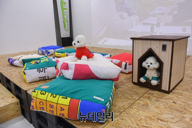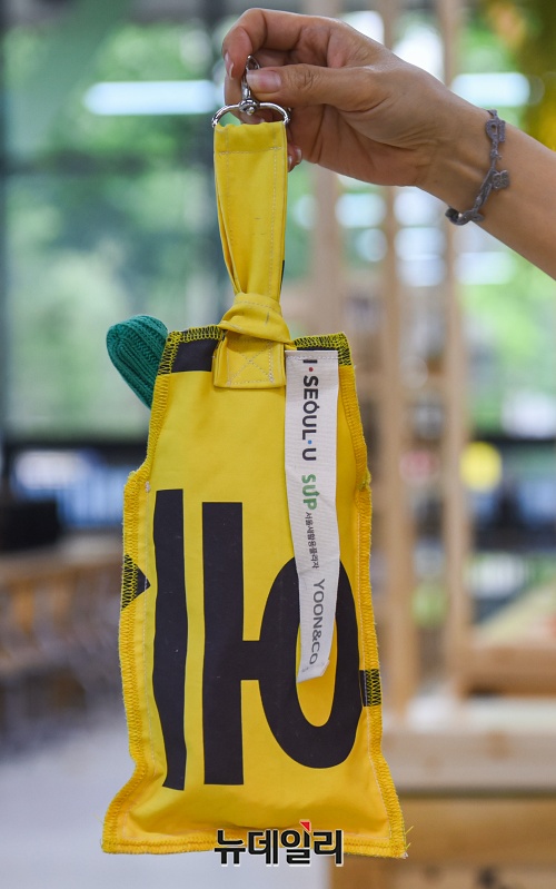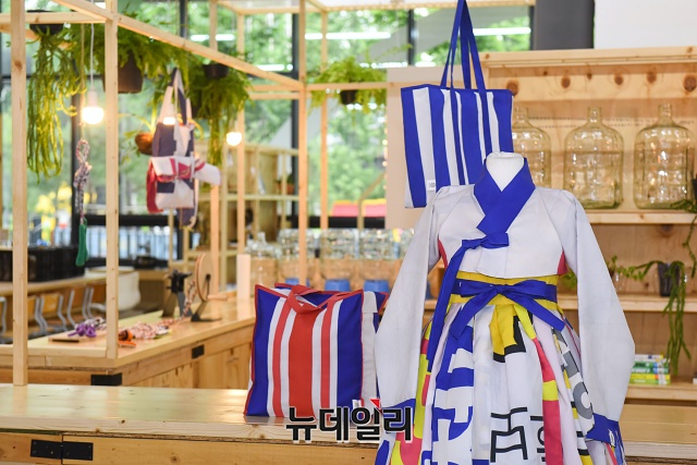 전시 제품은 폐현수막 약 450장을 활용한 한복, 줄넘기, 파라솔, 에코백, 돗자리, 반려견 침구, 멀티 파우치 등이다.