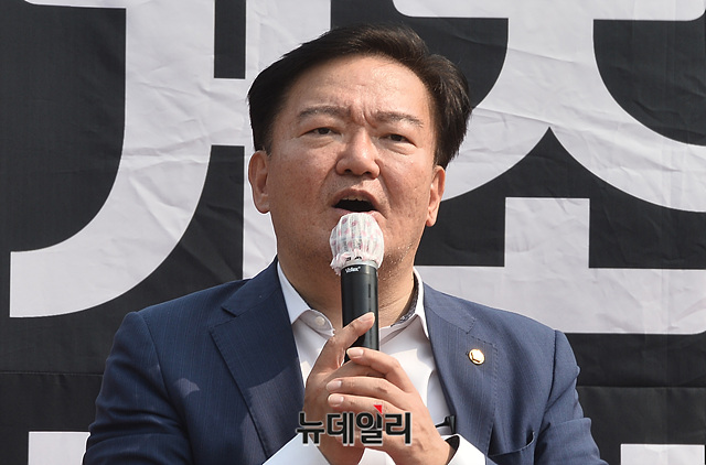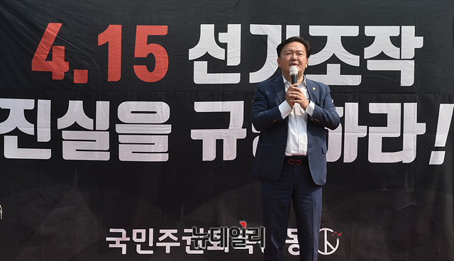 민경욱 미래통합당 의원이 23일 오후 서울 서초구 대검찰청 맞은편에서 열린 '국민주권회복운동 5.23 대결집'에서 발언을 하고 있다.민 의원은 "부정선거를 방치하면 민주선거는 다시없다. 미래통합당은 진상규명특위 즉각 설치해야 한다"고 말했다. 이어 "중앙선관위는 국민앞에 석고대죄해야 한다"고 말했다.집회에 참석한 시민들은 'FOLLOW the PARTY(당과 함께 간다)' '4.15 관련 부정 의혹 진실을 공개하라' '구리시 선관위는 증거인멸 중단하라' 'Don't allow RIGGED ELECTIONS(선거 조작을 허용하지 말라)' 등이 기재된 손 피켓을 들고 집회에 참여했다.지난 21일 민 의원은 "전산 숫자의 배열을 찾아내 문자로 변환시켰더니 중국 공산당 구호인 'FOLLOW the PARTY(당과 함께 간다)'가 나왔다"며 "이 구호는 중국의 해커가 심어놨다"고 주장하며 총선 전산조작 의혹을 제기했다.이날 열린 집회 관계자는 "이날 참여한 시민들은 검정색 옷과 검정색 우산을 들고 집회에 참석했다. 검정색의 의미는 4.15총선을 경험하고 느낀 감정, 즉 '민주주의는 죽었다'라는 의미"라고 말했다.이어 "이번 집회는 더운 날씨에도 불구하고 4.15부정선거 저항운동 실천을 위해 청년 주도하에 개최됐다"며 집회의 취지를 설명했다.국민주권회복운동본부는 30일 오후 2시 동일한 장소(대검찰청 맞은편)에서 집회를 가질 예정이다.