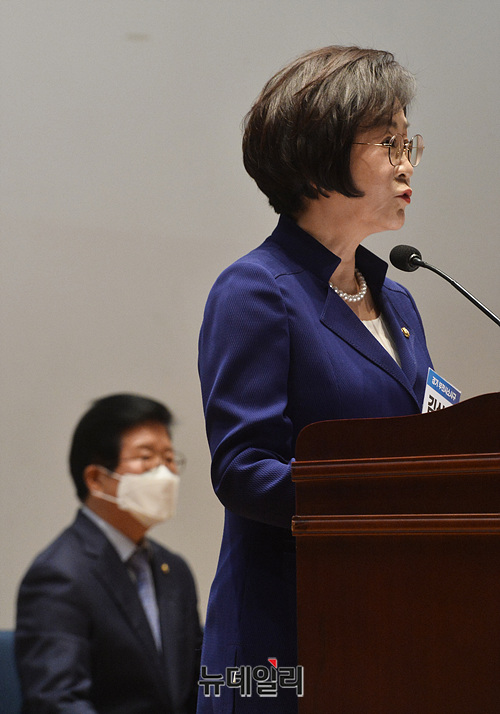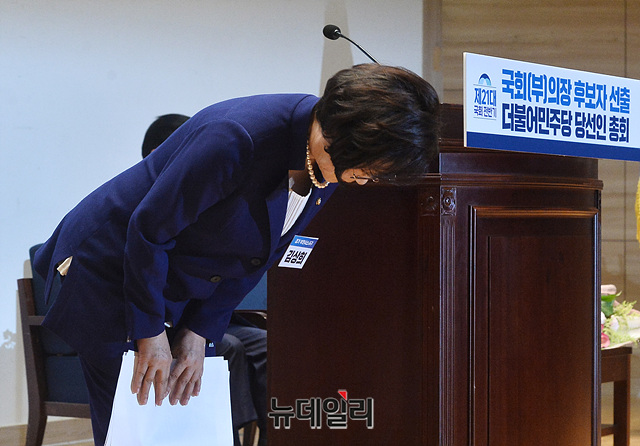 김상희 더불어민주당 국회 부의장 후보가 25일 오전 국회 의원회관에서 열린 '제21대 국회 전반기 국회(부)의장 더불어민주당 후보자 선출 당선인 총회'에서 후보 선출 후 인사말을 하고 있다.