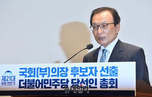 이해찬 더불어민주당 대표가 25일 오전 국회 의원회관에서 열린 '제21대 국회 전반기 국회(부)의장 더불어민주당 후보자 선출 당선인 총회'에서 인사말을 하고 있다.