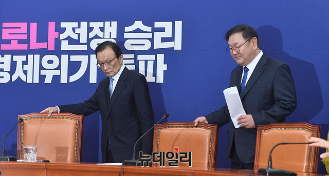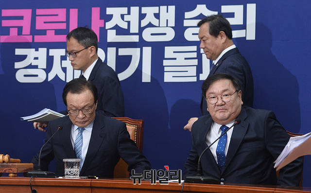 이해찬 더불어민주당 대표, 김태년 원내대표 등 지도부가 25일 오전 국회에서 열린 최고위원회의에 참석하고 있다.