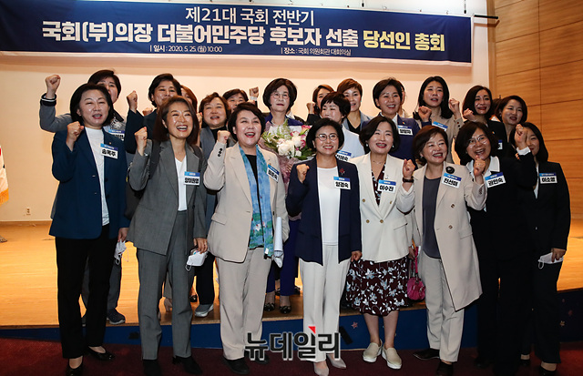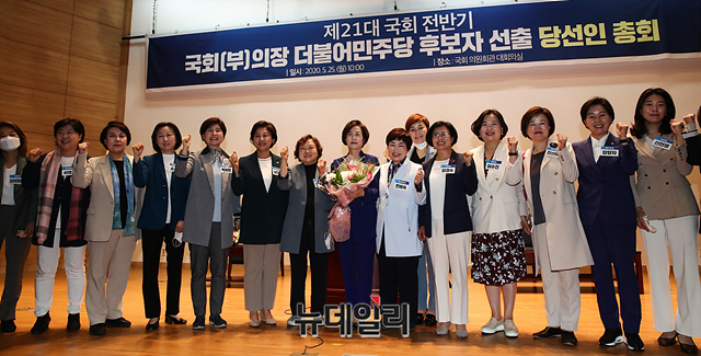 김상희 더불어민주당 국회 부의장 후보가 25일 국회에서 열린 '제21대 국회 전반기 더불어민주당 국회(부)의장 후보자 선출 당선인 총회'에서 국회 부의장 후보자에 선출된 후 여성의원, 여성당선인들과 기념촬영하고 있다.