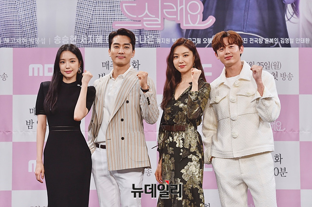 배우 송승헌(왼쪽부터), 손나은, 연출 고재현, 배우 서지혜, 이지훈이 25일 오후 온라인으로 진행된 새 월화미니시리즈 '저녁 같이 드실래요?' 제작발표회에서 포토타임을 갖고 있다.
