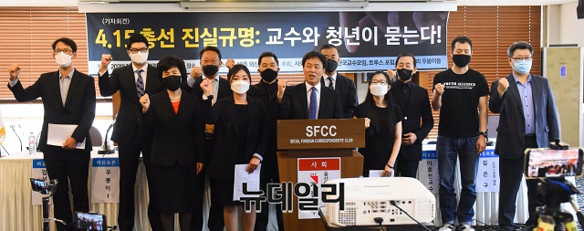 사회정의를바라는전국교수모임(정교모), 트루스포럼, 우붕이들 등 시민단체가 26일 오전 서울 중구 프레스센터에서 열린 '4.15총선 진실규명: 교수와 청년이 묻는다' 기자회견에서 진실규명을 촉구하는 구호를 외치고 있다.