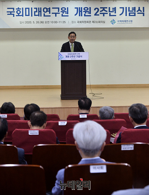주호영 미래통합당 대표 권한대행 겸 원내대표가 26일 오전 국회 의원회관에서 열린 국회미래연구원 개원 2주년 기념식에서 축사를 하고 있다.