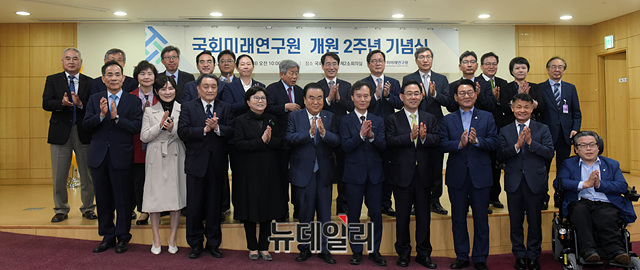 문희상 국회의장, 주호영 미래통합당 대표권한대행 겸 원내대표, 김선욱 이사장 등 참석자들이 26일 오전 국회 의원회관에서 열린 국회미래연구원 개원 2주년 기념식에서 기념촬영을 하고 있다.
