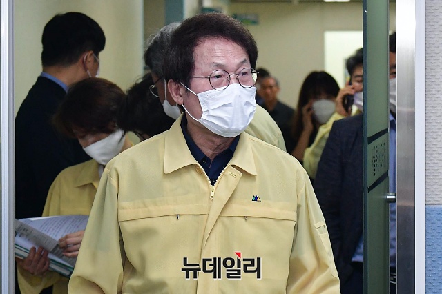 [포토] 등교수업 후속대책 발표, 입장하는 조희연 서울시교육감