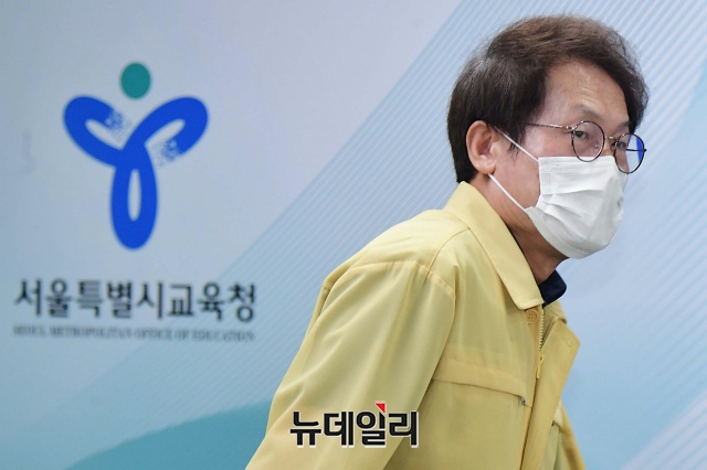 조희연 서울시교육감이 26일 오전 서울 종로구 서울시교육청에서 등교수업 후속대책 발표 기자회견에 입장하고 있다.