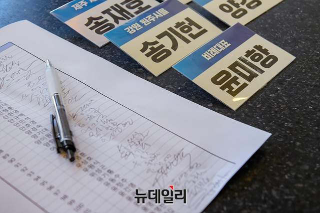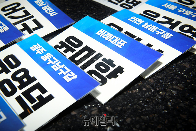 윤미향 더불어민주당 당선인의 명찰이 27일 오전 서울 서초구 더케이호텔에서 열린 '제21대 국회 더불어민주당 국회의원 당선인 워크숍' 프론트에 놓여 있다. 이날 윤 당선인은 워크숍에 불참했다.