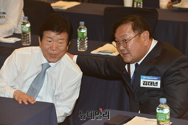 김태년 더불어민주당 원내대표와 박병석 후보자가 27일 오전 서울 서초구 더케이호텔에서 열린 '제21대 국회 더불어민주당 국회의원 당선인 워크숍'에서 대화를 나누고 있다.