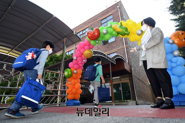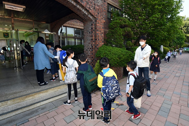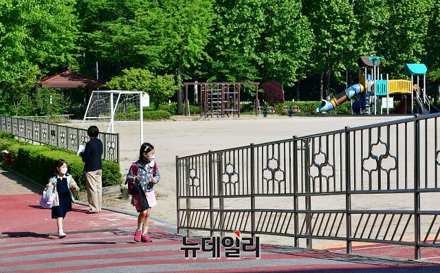 초등학교 1·2학년 등교 개학이 시작된 27일 오전 서울 송파구 세륜초등학교에 초등학생이 사회적 거리두기를 하며 등교하고 있다.