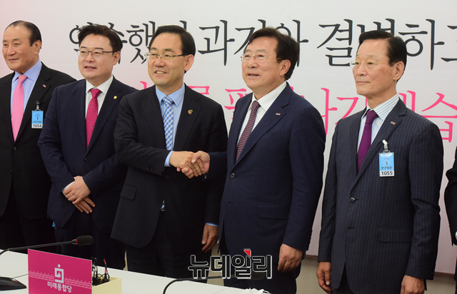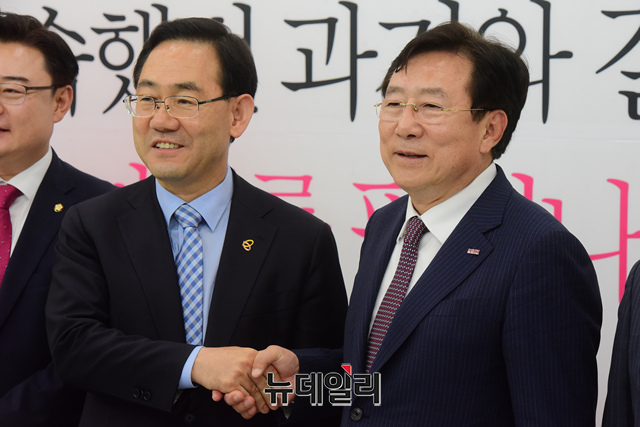 주호영 미래통합당 원내대표가 27일 오전 국회에서 김기문 중소기업중앙회장을 만나 악수를 나누고 있다.