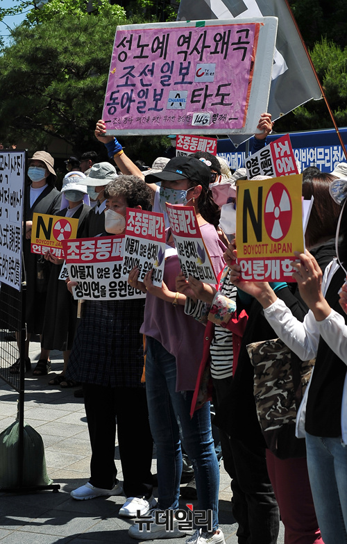 윤미향 전 정의기억연대(정의연) 이사장 논란이 이어지고 있는 27일 오후 서울 종로구 전 일본대사관 앞에서 위안부 수요집회가 이어지고 있다. 이들은 '보이콧 재팬' '조중동 폐간' 등의 손피켓을 들고 집회에 참가했다.