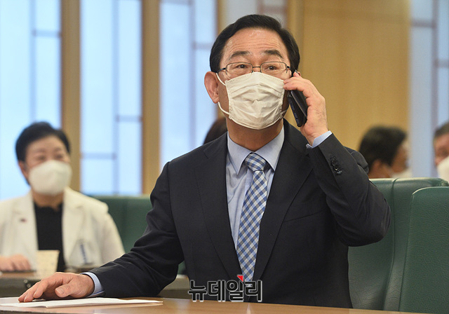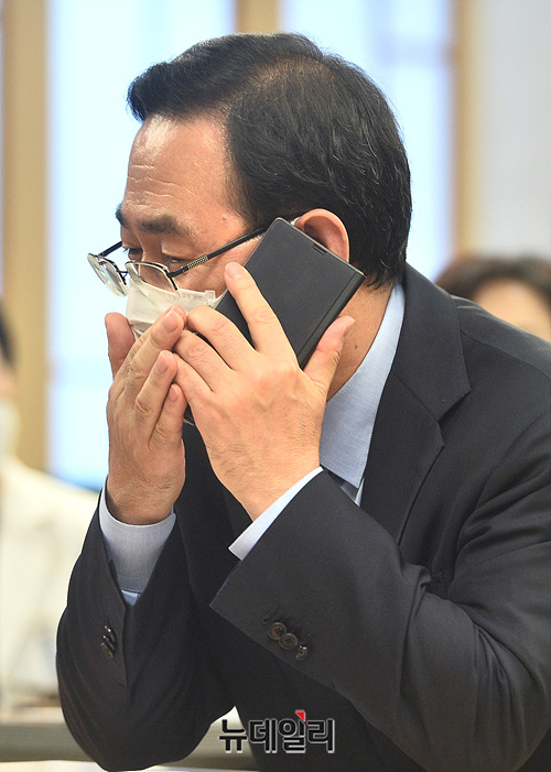 주호영 미래통합당 원내대표가 27일 오후 국회 의원회관에서 열린 제1차 상임전국위원회에서 누군가와 통화를 하고 있다.