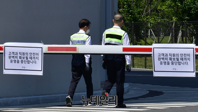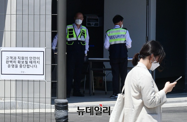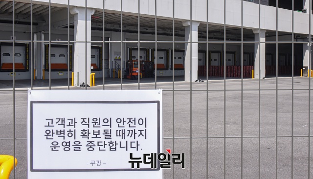 부천 쿠팡 물류센터 관련 '코로나19(중국 우한 폐렴)' 확진자가 증가하고 있는 27일 오후 경기 부천시 쿠팡 물류센터에 운영중단 안내문이 붙어있다. 이 물류센터와 관련된 확진자가 27일 오전 기준으로 36명까지 늘어난 상태다.안내문에는 "고객과 직원의 안전이 완벽히 확보될 때까지 운영을 중단한다"고 적혀있다.쿠팡측은 23일 부천 물류센터에 확진자가 나온 직후 방역을 완료했다. 25일 정상 가동 했지만 이후 추가 확진자가 발생해 센터를 폐쇄한 상태다.부천시는 '사회적 거리두기'를 다시 적용했다.(경기 부천=권창회 기자)