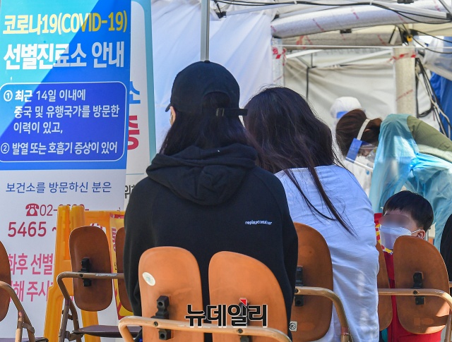 서울 강서구 일부 초등학교가 등교연기 된 27일 오후 서울 강서구 선별진료소에 한 아이가 검사받기 위해 대기하고 있다.