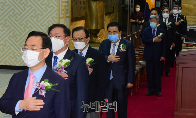 문희상 국회의장, 이해찬 더불어민주당 대표, 김태년 원내대표, 주호영 미래통합당 원내대표가 28일 오전 국회에서 열린 제72주년 국회 개원 기념식에서 국민의례를 하고 있다.