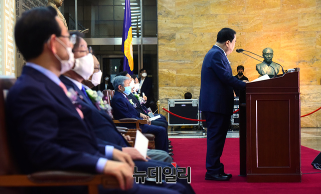 문희상 국회의장이 28일 오전 국회에서 열린 제72주년 국회 개원 기념식에서 발언을 하고 있다.