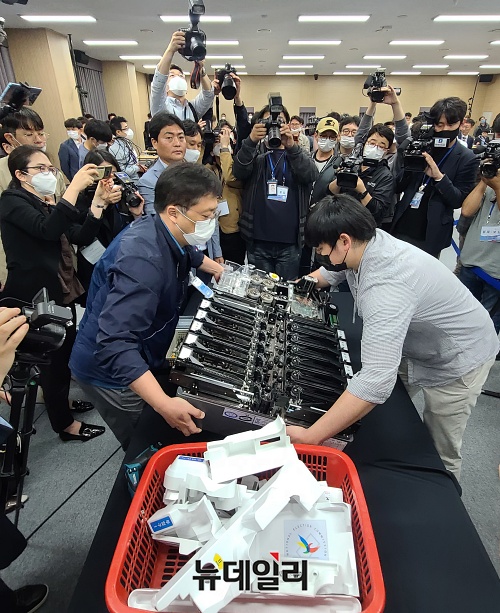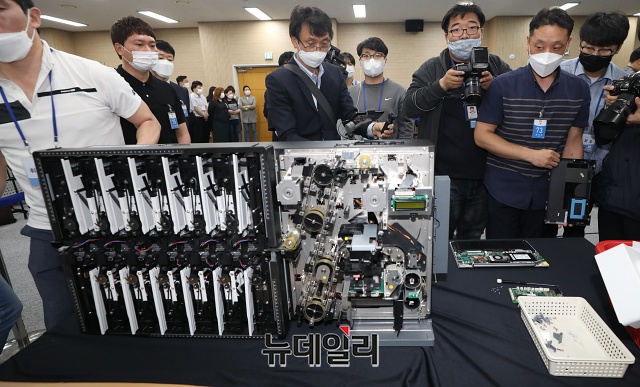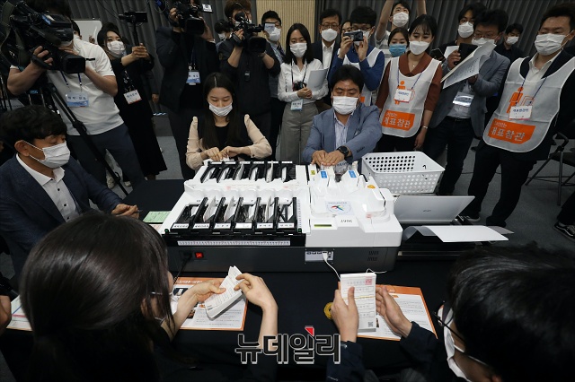 선관위 관계자가 28일 오후 경기 과천 중앙선거관리위원회에서 사전투표 및 개표 시연을 하고 있다.민경욱 미래통합당 의원은 투표지 분류기에 통신장치와 QR코드를 인식하는 센서가 있다고 주장하는 등 총선 조작 의혹을 제기해왔다.중앙선관위는 서버를 포함한 통신망의 보안체계와 투표지 분류기 등 선거 장비의 작동원리에 설명했다. 선거 결과 의혹제기로 중앙선관위가 공개 시연회를 여는건 18대 대선 관련 2013년 이후 7년만이다. (경기 과천=권창회 기자)