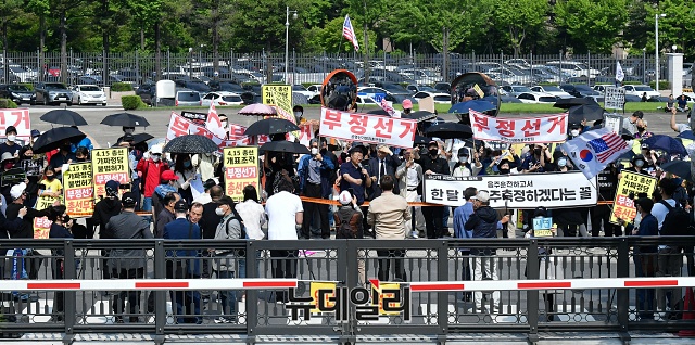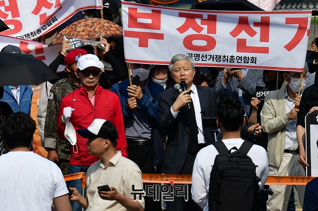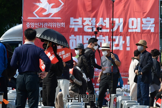 공명선거쟁취총연합회, 자유대한호국단 등 시민단체가 28일 오후 경기 과천시 중앙선거관리위원회 앞에서 부정선거 의혹과 관련해 진상규명을 요구하는 집회를 갖고 있다.