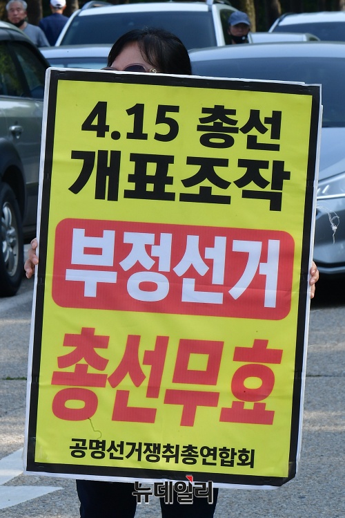 이들은 "총선무효 소송을 제기한 당사자들은 현장에 들어가지 못하게 막고 있다"며 "음주운전한 뒤 한 달 뒤에 음주측정 하겠다는 꼴"이라며 항의했다.