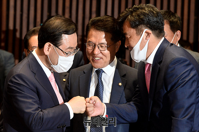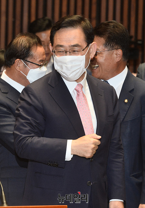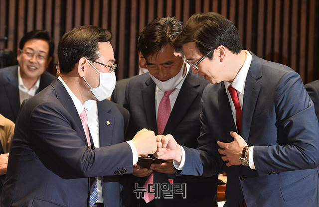 주호영 미래통합당 원내대표가 29일 오전 국회에서 열린 제3차 당선자총회에 입장하며 당선인들과 인사를 나누고 있다.