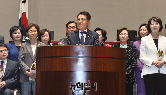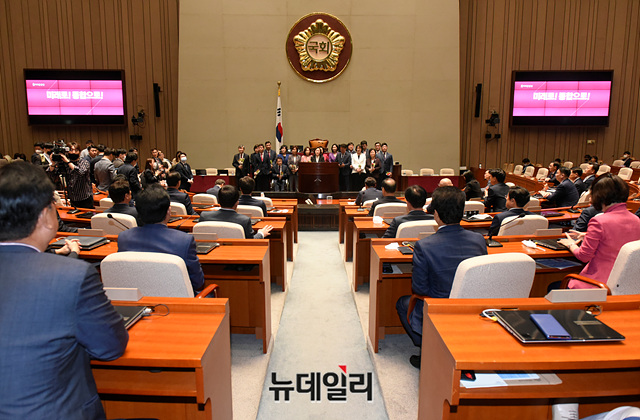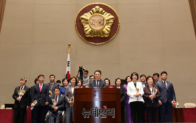 미래한국당 당선인들이 29일 오전 국회에서 열린 제3차 당선자총회에 참석해 인사말을 하고 있다. 통합당과 한국당은 28일 국회에서 합당 선포식을 가졌다.