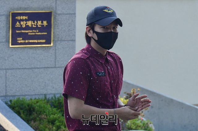 배우 장근석이 29일 오후 서울 중구 소방재난본부에서 사회복무요원으로 마지막 복무를 마치고 취재진을 향해 경례하고 있다.