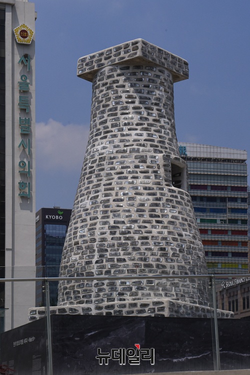 경주 첨성대를 모티브로 한 조형물이 29일 오후 서울 중구 서울도시건축전시관에 설치돼 있다. 작품명은 ‘환생(Rebirth)’으로 폐자동차에서 떼낸 헤드라이트 1,374개를 붙여 만들었다. 설치에 서울시 예산 6,500만원이 들었다. 전시관 측은 이 조형물이 "코로나 극복을 위한 희망의 메시지를 전파할 것"이라고 밝혔다.