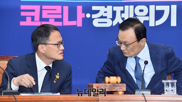 이해찬 더불어민주당 대표와 박주민 최고위원이 1일 오전 국회에서 열린 최고위원회의에 참석해 대화를 나누고 있다.