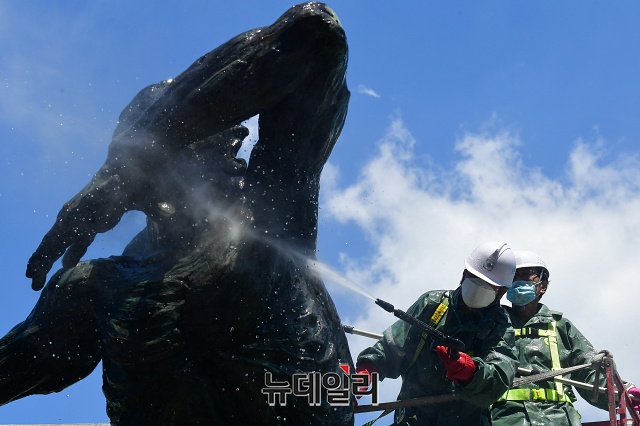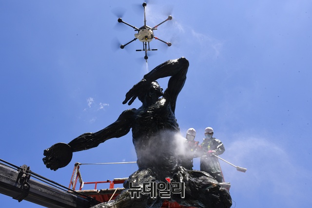 송파구청 관계자가 1일 오전 서울 송파구 올림픽공원 인근에서 드론을 이용해 올림픽 상징 조형물을 세척하고 있다.