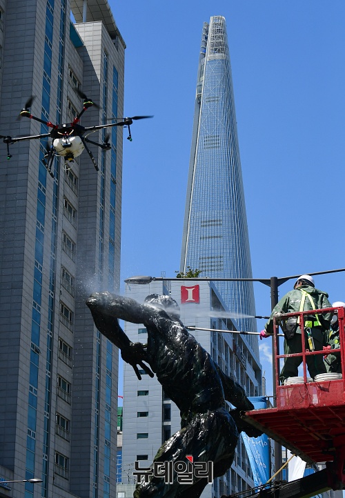 [포토] 드론 활용해 올림픽 조형물 세척하는 송파구청