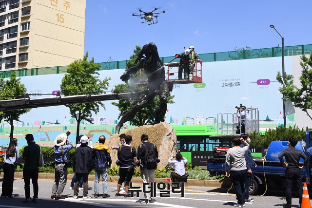 송파구는 4차 산업기술을 도입한 드론과 고압 세척기를 이용해 올림픽 상징 조형물 50점을 세척한다고 밝혔다.