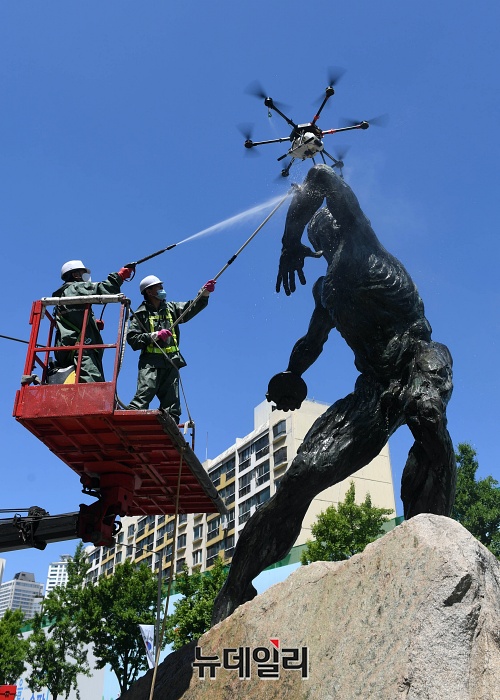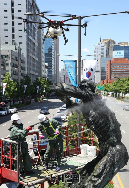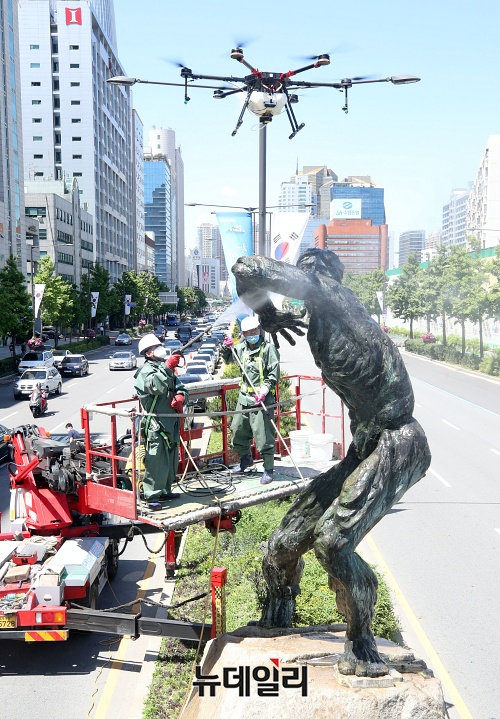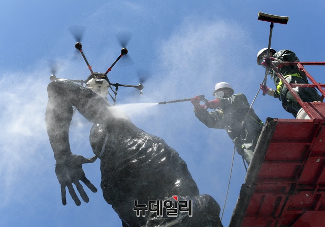 송파구는 4차 산업기술을 도입한 드론과 고압 세척기를 이용해 올림픽 상징 조형물 50점을 세척한다고 밝혔다.