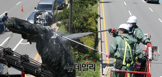 송파구청 관계자가 1일 오전 서울 송파구 올림픽공원 인근에서 올림픽 상징 조형물을 세척하고 있다.