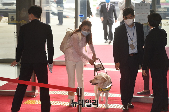 김예지 미래통합당 의원이 2일 오전 국회에서 열린 의원총회에 안내견 조이와 함께 입장하고 있다. 김 의원은 여성 최초 시각장애인 의원이다.