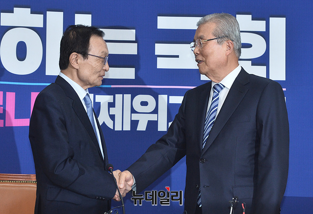 [포토] 32년 악연 '이해찬-김종인', 손 맞잡은 여·야 수장
