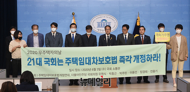 박주민·우원식·박홍근·장경태·전용기 등 더불어민주당 의원들과 주택임대차보허법개정연대가 3일 오후 국회 소통관 기자회견장에서 무주택자의날, 주택임대차보호법 개정 촉구 기자회견을 갖고 있다.