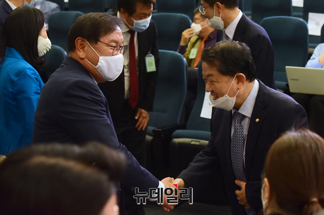 김태년 더불어민주당 원내대표가 3일 오후 국회 도서관에서 열린 '코로나19, 2차 대유행 어떻게 대비해야 하나?' 토론회에 참석하고 있다.