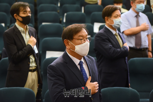 김태년 더불어민주당 원내대표가 3일 오후 국회 도서관에서 열린 '코로나19, 2차 대유행 어떻게 대비해야 하나?' 토론회에 참석해 국민의례를 하고 있다.