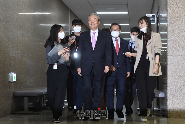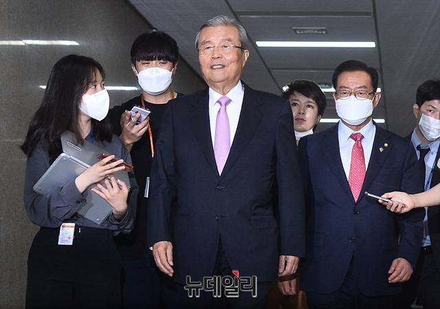 김종인 미래통합당 비상대책위원장, 이종배 정책위의장이 4일 오전 국회에서 열린 비상대책위원회의에 입장하고 있다.