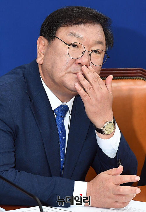 김태년 더불어민주당 원내대표가 4일 오전 국회에서 열린 당 정책조정회의에서 자료를 보고 있다.