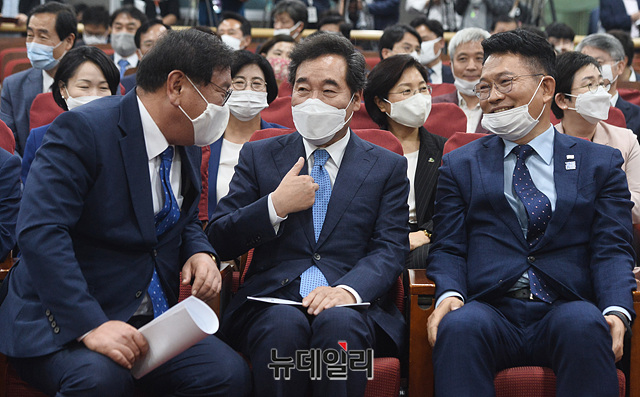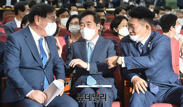 김태년 더불어민주당 원내대표, 이낙연 의원, 송영길 의원이 4일 오후 국회 의원회관에서 열린 '자치와 균형 포럼' 간담회에 참석해 대화를 나누고 있다.