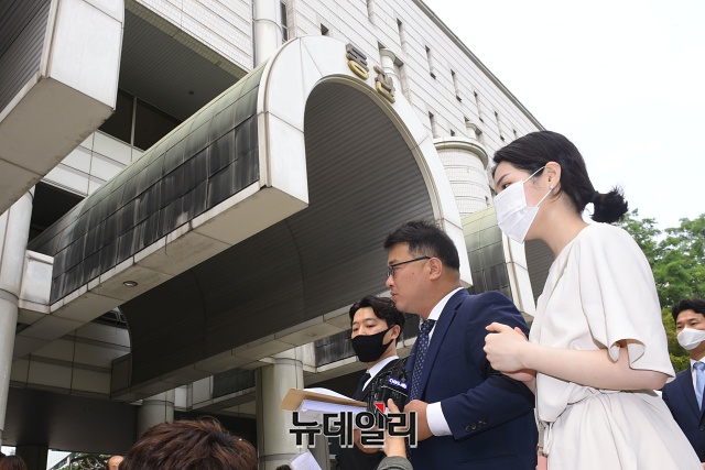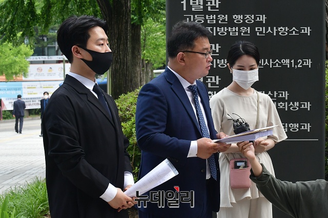 '위안부할머니기부금및후원금반환소송대책모임' 소송 대리인 김기윤 변호사가 4일 오후 서울 서초구 서울중앙지법 앞에서 나눔의 집 후원금 반환소송 관련 기자회견을 갖고 있다.