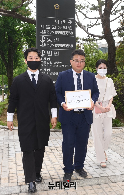 김영호 '위안부할머니기부금및후원금 반환소송대책모임' 대표, 김기윤 변호인, 강민서 씨가 4일 오후 서울 서초구 서울중앙지법으로 나눔의 집 후원금 반환소송 소장을 제출하기 위해 이동하고 있다.