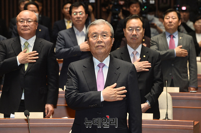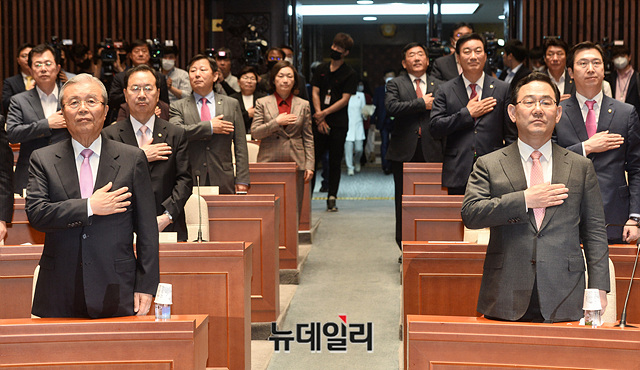 김종인 미래통합당 비상대책위원장, 주호영 원내대표, 이종배 정책위의장 등 의원들이 4일 오후 국회에서 열린 미래통합당 제2차 의원총회에서 국민의례를 하고 있다.