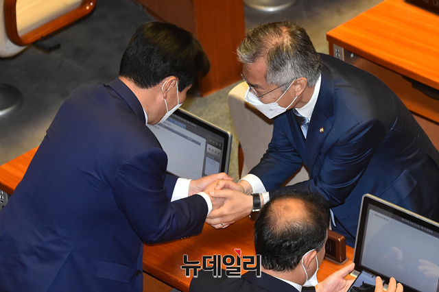 [포토] 의원들과 악수 나누는 최강욱 열린민주당 대표