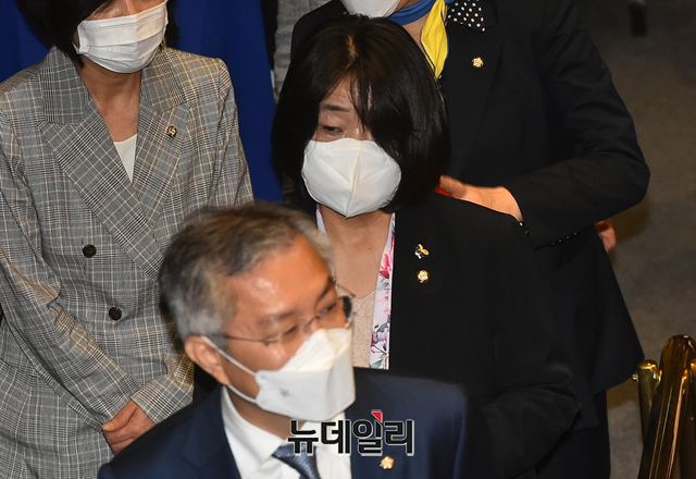 최강욱 열린민주당 대표와 윤미향 더불어민주당 의원이 5일 오전 국회에서 열린 제21대 국회 첫 본회의를 마치고 회의장을 떠나고 있다.